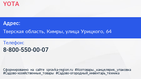 YOTA по адресу Тверская область, Кимры, улица Урицкого, 64 в дальнейшем Организация, размещена в следующих категориях: