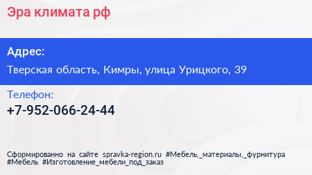 Эра-климата.рф по адресу Тверская область, Кимры, улица Урицкого, 39 в дальнейшем Организация, размещена в следующих категориях: