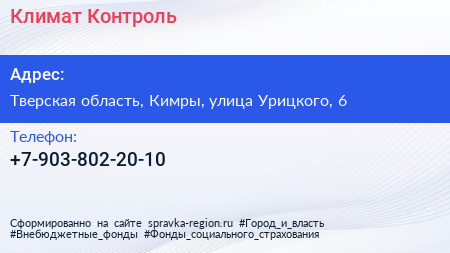 Климат-Контроль по адресу Тверская область, Кимры, улица Урицкого, 6 в дальнейшем Организация, размещена в следующих категориях: