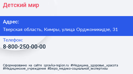 Детский мир по адресу Тверская область, Кимры, улица Орджоникидзе, 31 в дальнейшем Организация, размещена в следующих категориях: