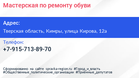 Мастерская по ремонту обуви по адресу Тверская область, Кимры, улица Кирова, 12а в дальнейшем Организация, размещена в следующих категориях: