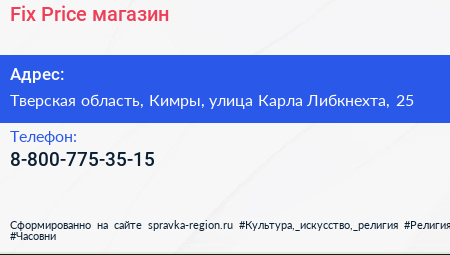 Fix Price, магазин по адресу Тверская область, Кимры, улица Карла Либкнехта, 25 в дальнейшем Организация, размещена в следующих категориях: