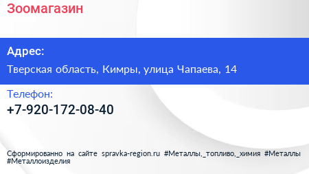 Зоомагазин по адресу Тверская область, Кимры, улица Чапаева, 14 в дальнейшем Организация, размещена в следующих категориях:
