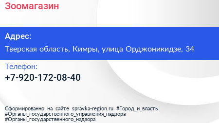 Зоомагазин по адресу Тверская область, Кимры, улица Орджоникидзе, 34 в дальнейшем Организация, размещена в следующих категориях: