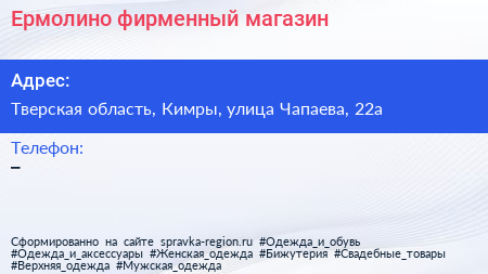 Ермолино, фирменный магазин по адресу Тверская область, Кимры, улица Чапаева, 22а в дальнейшем Организация, размещена в следующих категориях: