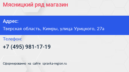Мясницкий ряд, магазин по адресу Тверская область, Кимры, улица Урицкого, 27а в дальнейшем Организация, размещена в следующих категориях: