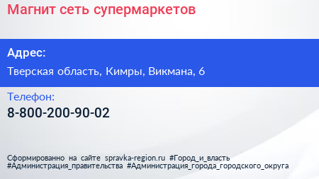 Магнит, сеть супермаркетов по адресу Тверская область, Кимры, Викмана, 6 в дальнейшем Организация, размещена в следующих категориях: