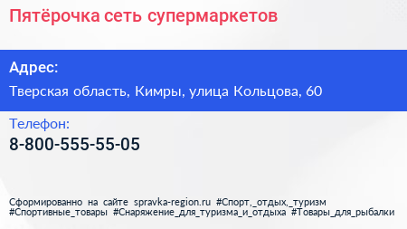Пятёрочка, сеть супермаркетов по адресу Тверская область, Кимры, улица Кольцова, 60 в дальнейшем Организация, размещена в следующих категориях: