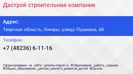 Дастрой, строительная компания по адресу Тверская область, Кимры, улица Пушкина, 68 в дальнейшем Организация, размещена в следующих категориях: