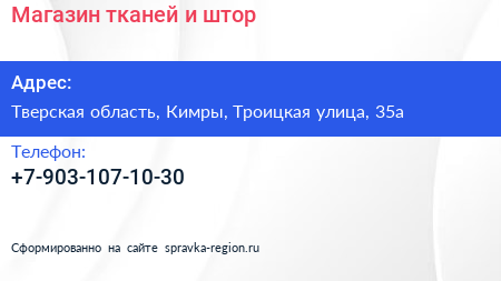 Магазин тканей и штор по адресу Тверская область, Кимры, Троицкая улица, 35а в дальнейшем Организация, размещена в следующих категориях: