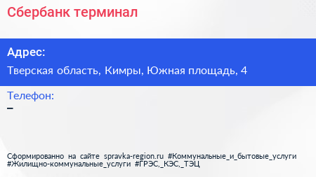 Сбербанк, терминал по адресу Тверская область, Кимры, Южная площадь, 4 в дальнейшем Организация, размещена в следующих категориях: