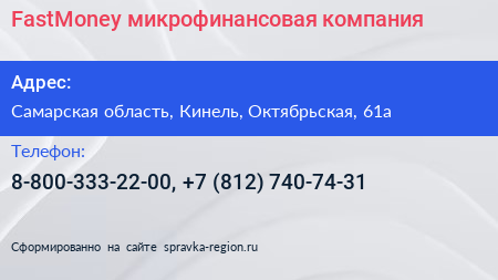 FastMoney, микрофинансовая компания по адресу Самарская область, Кинель, Октябрьская, 61а в дальнейшем Организация, размещена в следующих категориях: