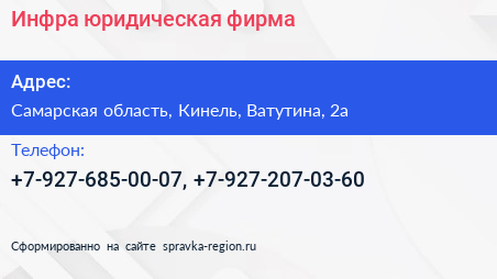 Инфра, юридическая фирма по адресу Самарская область, Кинель, Ватутина, 2а в дальнейшем Организация, размещена в следующих категориях: