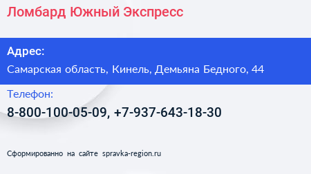 Ломбард Южный Экспресс по адресу Самарская область, Кинель, Демьяна Бедного, 44 в дальнейшем Организация, размещена в следующих категориях: