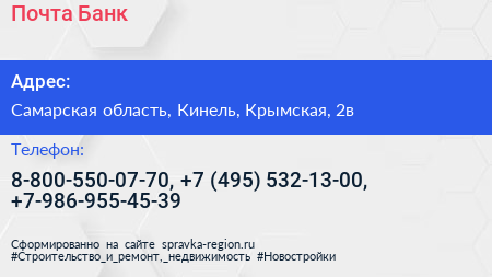 Почта Банк по адресу Самарская область, Кинель, Крымская, 2в в дальнейшем Организация, размещена в следующих категориях: