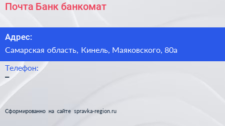 Почта Банк, банкомат по адресу Самарская область, Кинель, Маяковского, 80а в дальнейшем Организация, размещена в следующих категориях: