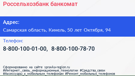 Россельхозбанк, банкомат по адресу Самарская область, Кинель, 50 лет Октября, 94 в дальнейшем Организация, размещена в следующих категориях: