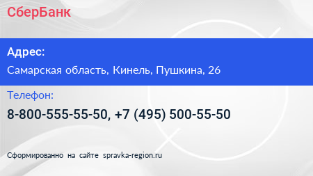 СберБанк по адресу Самарская область, Кинель, Пушкина, 26 в дальнейшем Организация, размещена в следующих категориях: