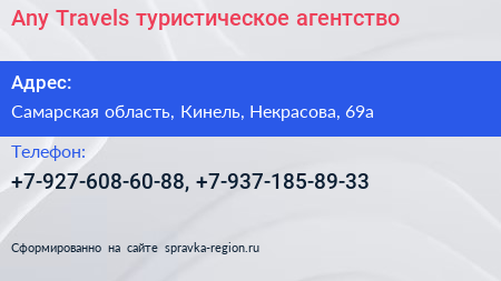Any Travels, туристическое агентство по адресу Самарская область, Кинель, Некрасова, 69а в дальнейшем Организация, размещена в следующих категориях: