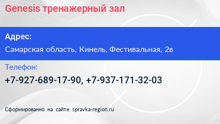 Genesis, тренажерный зал по адресу Самарская область, Кинель, Фестивальная, 2в в дальнейшем Организация, размещена в следующих категориях: