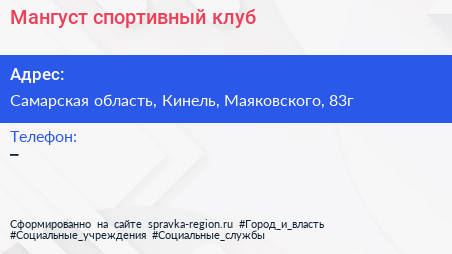 Мангуст, спортивный клуб по адресу Самарская область, Кинель, Маяковского, 83г в дальнейшем Организация, размещена в следующих категориях: