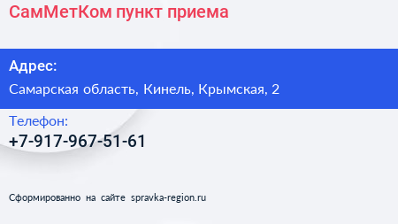 СамМетКом, пункт приема по адресу Самарская область, Кинель, Крымская, 2 в дальнейшем Организация, размещена в следующих категориях: