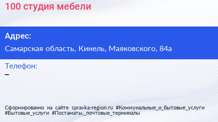 100%, студия мебели по адресу Самарская область, Кинель, Маяковского, 84а в дальнейшем Организация, размещена в следующих категориях: