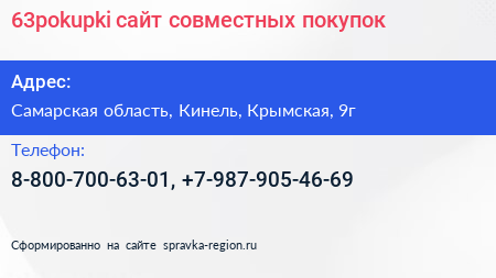 63pokupki, сайт совместных покупок по адресу Самарская область, Кинель, Крымская, 9г в дальнейшем Организация, размещена в следующих категориях: