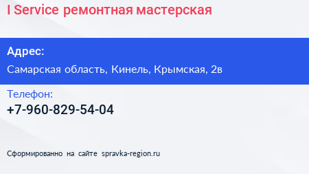 I-Service, ремонтная мастерская по адресу Самарская область, Кинель, Крымская, 2в в дальнейшем Организация, размещена в следующих категориях:
