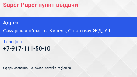 Super Puper, пункт выдачи по адресу Самарская область, Кинель, Советская ЖД, 64 в дальнейшем Организация, размещена в следующих категориях: