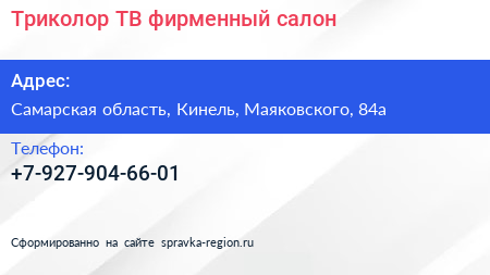 Триколор ТВ, фирменный салон по адресу Самарская область, Кинель, Маяковского, 84а в дальнейшем Организация, размещена в следующих категориях: