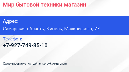 Мир бытовой техники, магазин по адресу Самарская область, Кинель, Маяковского, 77 в дальнейшем Организация, размещена в следующих категориях:
