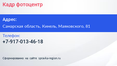 Кадр, фотоцентр по адресу Самарская область, Кинель, Маяковского, 81 в дальнейшем Организация, размещена в следующих категориях: