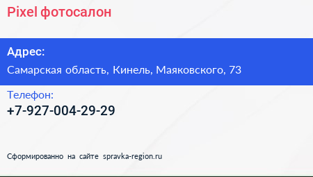 Pixel, фотосалон по адресу Самарская область, Кинель, Маяковского, 73 в дальнейшем Организация, размещена в следующих категориях: