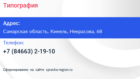 Типография по адресу Самарская область, Кинель, Некрасова, 68 в дальнейшем Организация, размещена в следующих категориях: