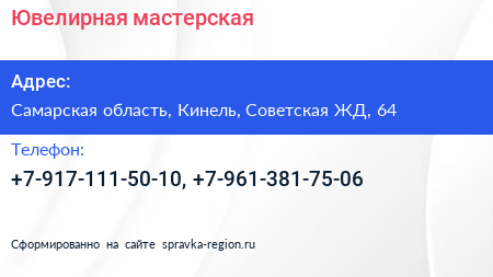 Ювелирная мастерская по адресу Самарская область, Кинель, Советская ЖД, 64 в дальнейшем Организация, размещена в следующих категориях: