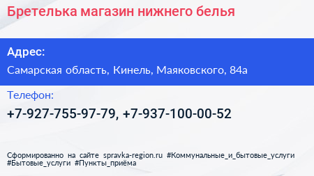 Бретелька, магазин нижнего белья по адресу Самарская область, Кинель, Маяковского, 84а в дальнейшем Организация, размещена в следующих категориях: