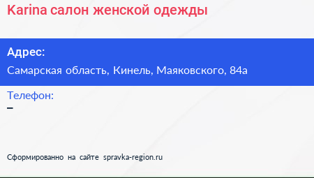 Karina, салон женской одежды по адресу Самарская область, Кинель, Маяковского, 84а в дальнейшем Организация, размещена в следующих категориях: