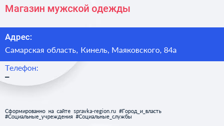 Магазин мужской одежды по адресу Самарская область, Кинель, Маяковского, 84а в дальнейшем Организация, размещена в следующих категориях: