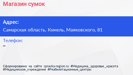 Магазин сумок по адресу Самарская область, Кинель, Маяковского, 81 в дальнейшем Организация, размещена в следующих категориях: