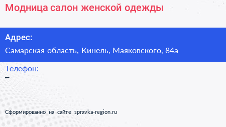 Модница, салон женской одежды по адресу Самарская область, Кинель, Маяковского, 84а в дальнейшем Организация, размещена в следующих категориях:
