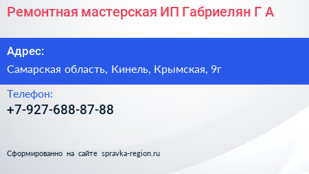 Ремонтная мастерская, ИП Габриелян Г.А. по адресу Самарская область, Кинель, Крымская, 9г в дальнейшем Организация, размещена в следующих категориях: