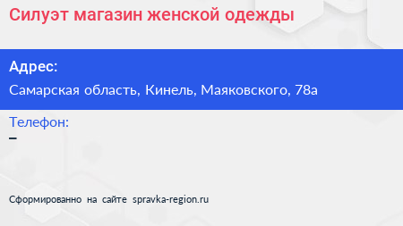 Силуэт, магазин женской одежды по адресу Самарская область, Кинель, Маяковского, 78а в дальнейшем Организация, размещена в следующих категориях: