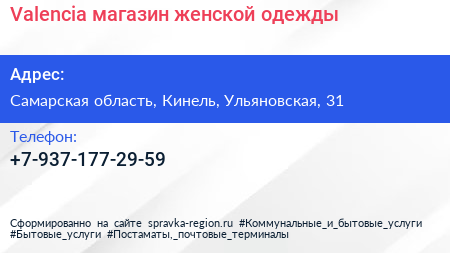 Valencia, магазин женской одежды по адресу Самарская область, Кинель, Ульяновская, 31 в дальнейшем Организация, размещена в следующих категориях: