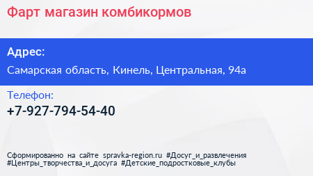 Фарт, магазин комбикормов по адресу Самарская область, Кинель, Центральная, 94а в дальнейшем Организация, размещена в следующих категориях: