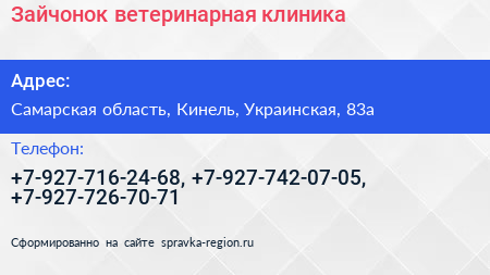 Зайчонок, ветеринарная клиника по адресу Самарская область, Кинель, Украинская, 83а в дальнейшем Организация, размещена в следующих категориях:
