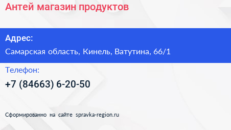 Антей, магазин продуктов по адресу Самарская область, Кинель, Ватутина, 66/1 в дальнейшем Организация, размещена в следующих категориях: