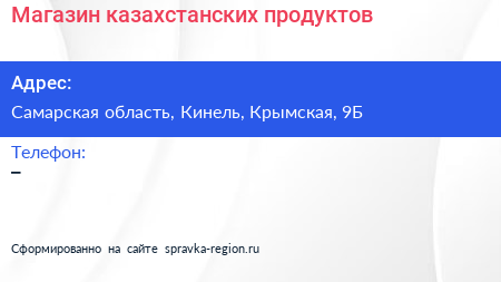 Магазин казахстанских продуктов по адресу Самарская область, Кинель, Крымская, 9Б в дальнейшем Организация, размещена в следующих категориях:
