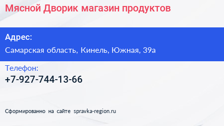 Мясной Дворик, магазин продуктов по адресу Самарская область, Кинель, Южная, 39а в дальнейшем Организация, размещена в следующих категориях:
