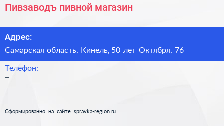 Пивзаводъ, пивной магазин по адресу Самарская область, Кинель, 50 лет Октября, 76 в дальнейшем Организация, размещена в следующих категориях: